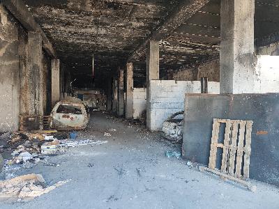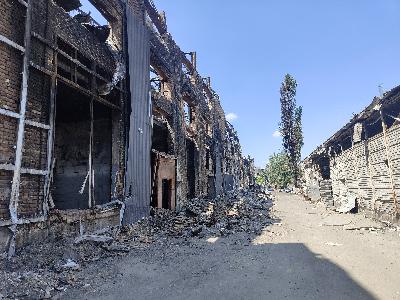 Fot. 21. Hala w kijowskiej dzielnicy przemysłowej po nocnym ataku z 17 na 18 czerwca 2025. Pożar trawił ją dwa dni. Zdjęcie wykonane w lipcu 2025. Sporo gruzu już uprzątnięto [fot. własne].